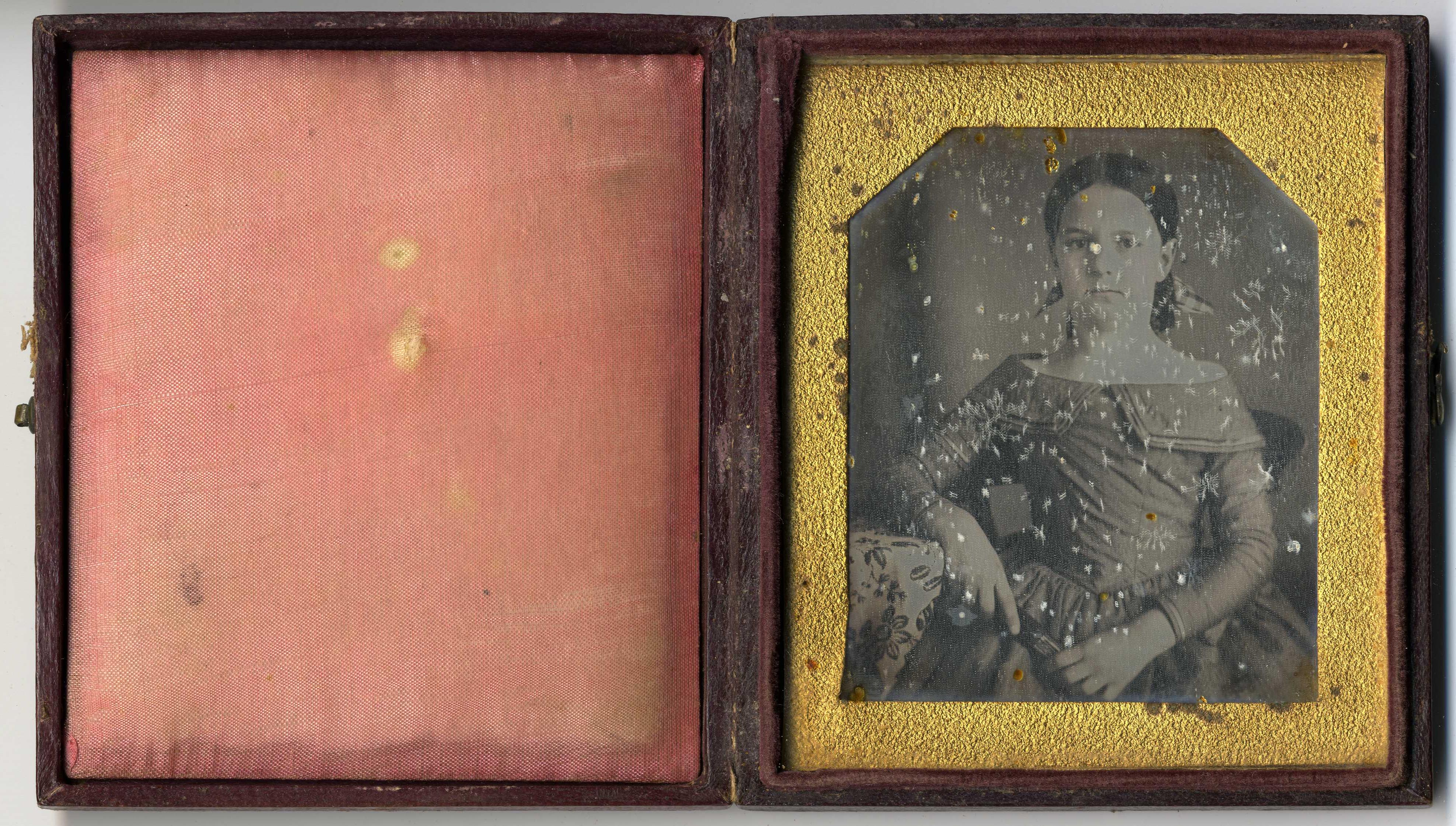 I was specifically searching for daguerrotypes of young girls. Almost immediately I came across one – a young girl sitting, holding what appears to be a fan. Based on the simple design of the gold frame I surmised that the photograph was a particularily old example. As I read the tiny, folded piece of paper identifying the subject of the image I almost fell over. It was “Antoinette Knowles, born Jan. 1837.”