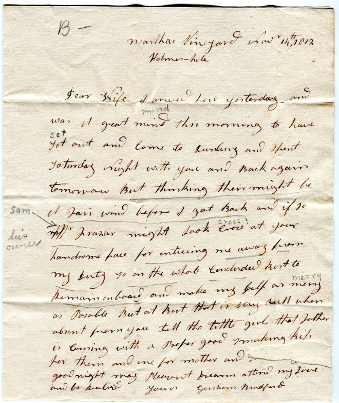Capt. Gershom Bradford (Martha’s Vineyard) to his wife, Sarah Hickling Bradford (Duxbury, MA), November 14, 1812.