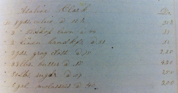 What I find fascinating about the book is what it tells us about society in the 1850’s. Here, in neat script, is a full listing of all the items a person might consider purchasing along with their cost. Duxbury was no longer the prosperous shipbuilding mecca it had once been, but that did not mean its inhabitants didn’t still pine for kid gloves and cashmere. Using her classmates and relations as fictitious “customers” Ardelia itemized a veritable Ante-bellum wish-list. Classmate Frederick Bryant, for example, lavishly spent $6.00 on “1 pair of pantaloons for my hired man” but also more sensibly required coarse salt at 1 ¾ per pound, and even a “white wash brush” for $.63. Girlfriends like Josephine Thomas bought “muslin de laine ($.31 per yard), 2 skeins of silk ($.08).” Ardelia’s young cousin, Walter F. Cushman, required a “silk handkerchief ($.50) and a cravat ($1.50).” Older family acquaintances also made it into her accounts, Capt. George P. Richardson was a regular customer, buying “kid gloves ($.75), 29 yards of carpeting ($21.00), a satin vest ($3.25), 1 yard cambric ($.10) and ½ dozen buttons ($.03)” all in one day. In total Ardelia kept her account book for four months, had eleven customers and over 150 entries with hundreds of line-items. While I have not vetted the prices she ascribed to them, the items themselves are a boon to any researcher interested in knowing what was available to purchase in America at that time.