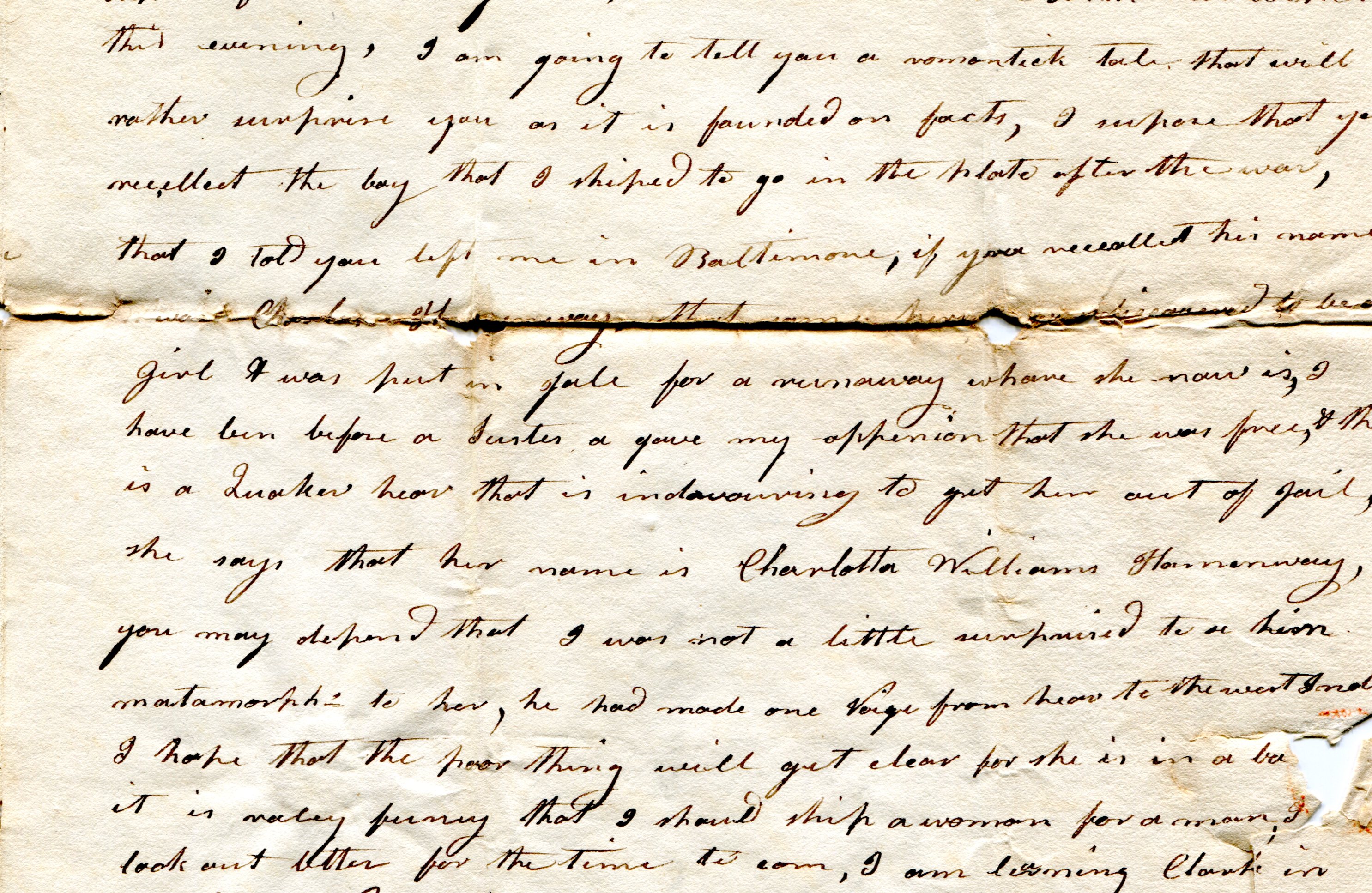 “…I am going to tell you a romantic tale that will rather surprise you as it is founded on facts, I suppose that you recollect the boy that I shipped to go in the Plato after the war, that I told you left me in Baltimore, if you recollect his name was Charles Hemenway, that same person was discovered to be a girl & was put in jail for a runaway where she now is. [1] I have been before a Justice & gave my opinion that she was free, & there is Quaker here that is endeavoring to get her out of jail. She says that her name is Charlotte Williams Hemenway. You may depend that I was not a little surprised to see him metamorphed, he had made one voyage from here to the West Indies. I hope that the poor thing will get clear for she is in a bad [torn page]. It is really funny that I should ship a woman for a man, I will look out better for the time to come…”[2]