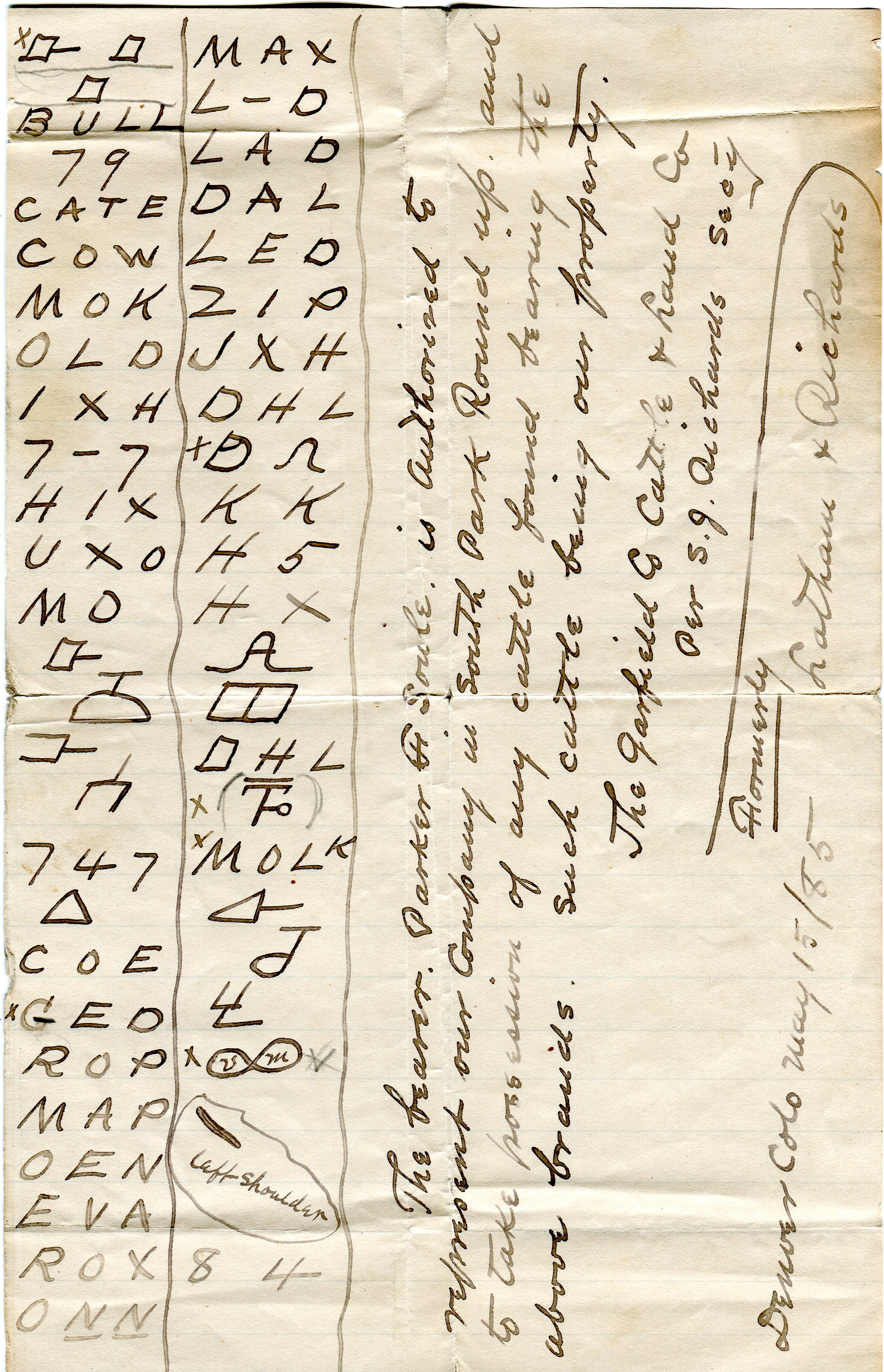 Instructions from Selden J. Richards to Parker F. Soule with brands to be found at the South Park Round Up, 1885.