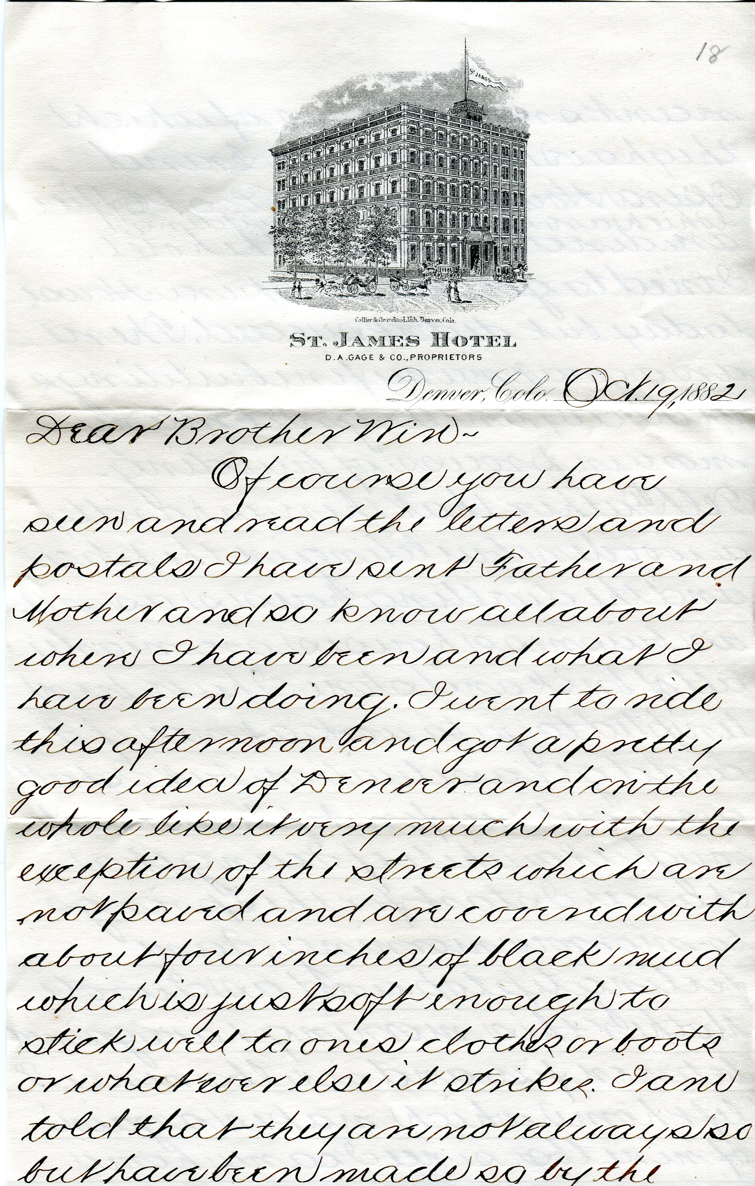 Letter from Parker F. Soule to his brother, Winthrop P. Soule, soon after arriving in Denver, Colorado. Oct. 19, 1882.