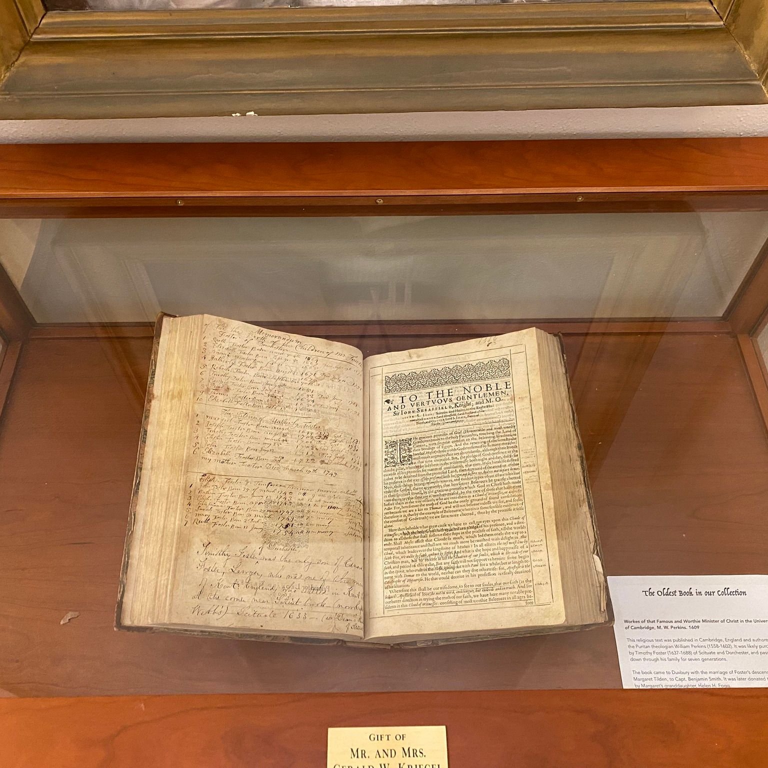 Despite Benjamin Smith’s oversized flourish, the book did not originate with a Smith ancestor in the 1600s. It was gifted and loaned many times, and that is part of the fun, to piece out who owned it, where, and when. While we may never know who brought it to the New England colonies, our story begins with Deacon Joseph Turner (1649-1724) of Scituate, the son of one of the town’s founders. Turner wrote on a blank page about 3/4 of the way through the book, “Joseph Turner his book God give him grace to in it to look.” Perhaps he studied its pages upon hearing of the witchcraft trials in Salem in 1692. He loaned the book for a time to Rev. Nathaniel Ells Jr. (1677-1750). In 1698, Turner’s daughter Bathsheba married Deacon Hatherly Foster in Scituate. The book eventually made its way to Bathsheba’s son, Elisha Foster, who recorded three generations of Foster births within its pages, beginning with the children of his grandfather, Thomas Foster of Dorchester. This “Fosterization” of the book makes it appear that it had been in the hands of the Fosters since the 1600s, but these early births were written by Elisha in the 1750s. A later page includes the birth of Peggy Foster on August 5, 1772 at eight in the morning. Peggy would go on to marry Samuel Tilden. Their daughter Margaret Tilden (1791-1851) of Scituate married Capt. Benjamin Smith Sr. of Duxbury in 1812. The Smith’s children included the above mentioned Benjamin, Hambelton, and Helen. So, it is easy to trace more than 300 years of the book’s history from Scituate to Duxbury.