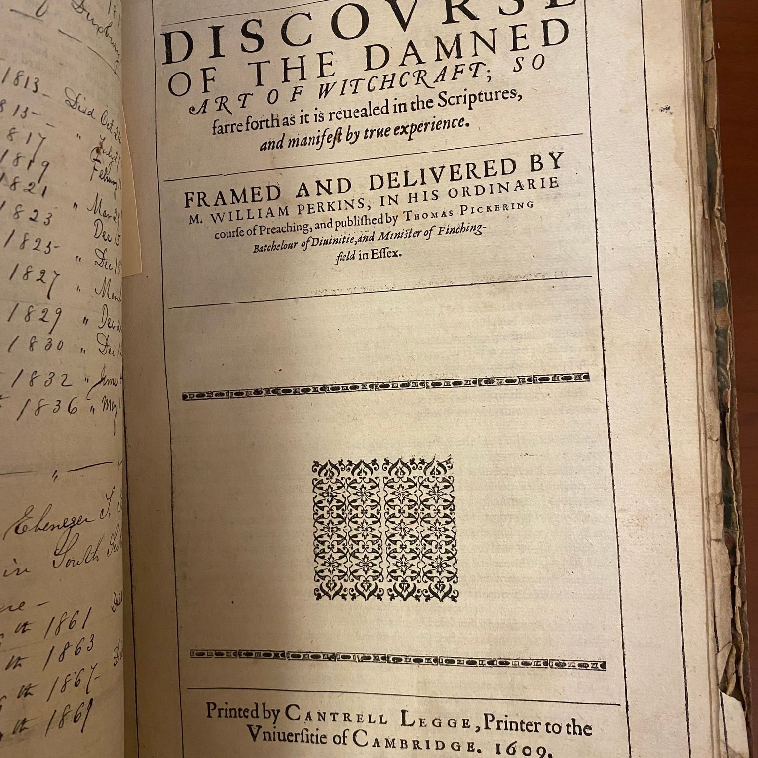 The book’s almost 700 pages contain eleven commentaries on religious subjects by Perkins. Today’s reader would undoubtedly find the commentary A Discourse of the Damned Art of Witchcraft the most intriguing. Witches were not the stuff of fairy tales or legends in the 17th century; they were very real beings. According to Perkins, the practice of witchcraft was “rife and common in these our dais, and very many are intangled with it.” Perkins described witches as those who made a pact with the Devil. They could see into the future, use the black arts, and make wonders occur through charms and spells.