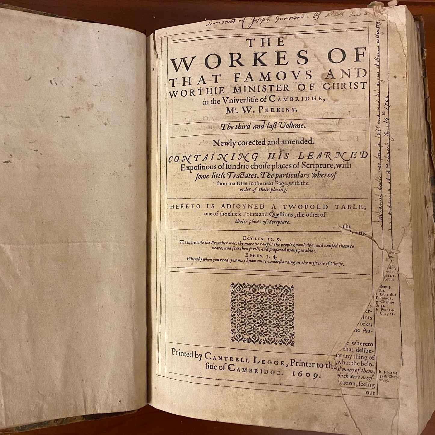 October is the perfect time to describe the oldest, and maybe spookiest, book in the DRHS’ Drew Archival Library’s vast collection. The Workes of that Famous and Worthie Minister of Christ in Universitie of Cambridge, M. W. Perkins. Published in England in 1609, the book is a compilation of the writings of the noted Protestant Reformation theologian Rev. William Perkins. The volume is large, measuring 12″ x 8.5″ x 2.5″, and is bound in leather with marbled end-papers. This is not, however, the original binding. The pages were cut down at some point, as evidenced by partially missing handwritten notes on the top margins of some pages.