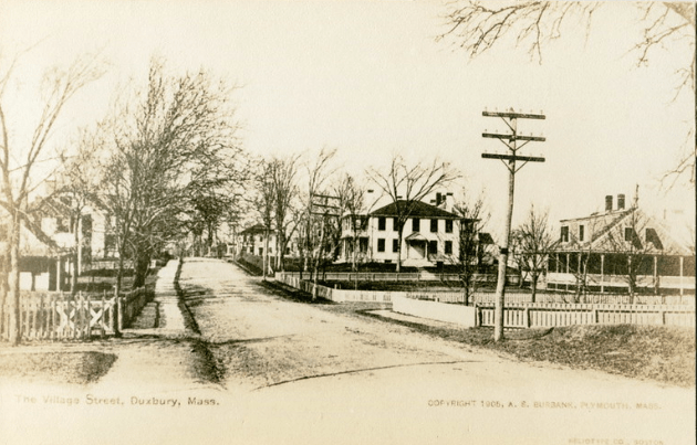 In looking back at Duxbury eighty years ago [1840s] one sees a great change. In those days the town was occupied only by the natives and life there was simple and plain. Once in a while it would be startled by some scandal or a runaway match, but on the whole it was very respectable and remarkably free from squalid poverty or disreputable places. It was long before the era of good roads and they were so sandy that as the heavy four-horse yellow stagecoach made its daily trips to Boston the sand came up on the wheels and fell over on the other side, and it took all day to make the trip. I remember of making it once with my mother to visit my grandmother, who lived in West Cedar Street, Boston.