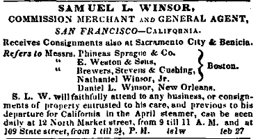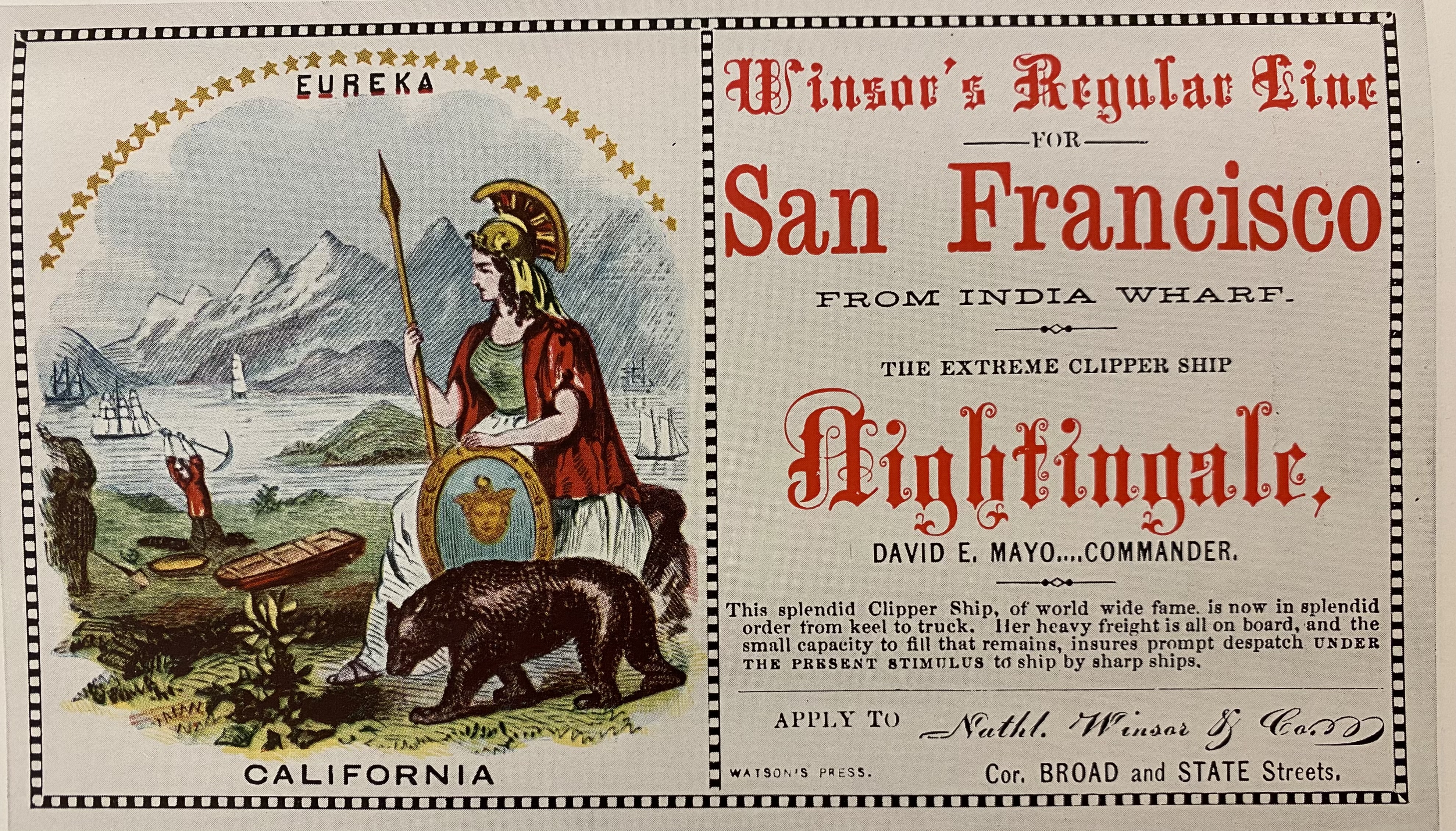 The Duxbury Rural & Historical Society’s headquarters at 479 Washington Street, built by Nathaniel and Hannah Winsor in 1807, has multiple connections to the Gold Rush through four of the Winsor sons. The aforementioned Nathaniel Winsor III was raised in the house, he later owned it and summered there once he moved to Boston. Another son, Capt. Charles F. Winsor sailed for the Winsor line and eventually retired to California, where he became the keeper of the East Brother Light in Richmond, CA. Son Samuel L. Winsor sailed to San Francisco in 1850 aboard the Cherokee and opened a store with his Duxbury friend, John S. Loring, provisioning miners. Before leaving Boston, he advertised his ability to take on consignments of cargo heading west. Finally, the youngest son, Henry Winsor, headed to San Fran aboard the Winsor ship Constantine, captained by Charles F. Winsor. He is rumored to have struck it rich in the mines, only to mysteriously disappear on his voyage home.